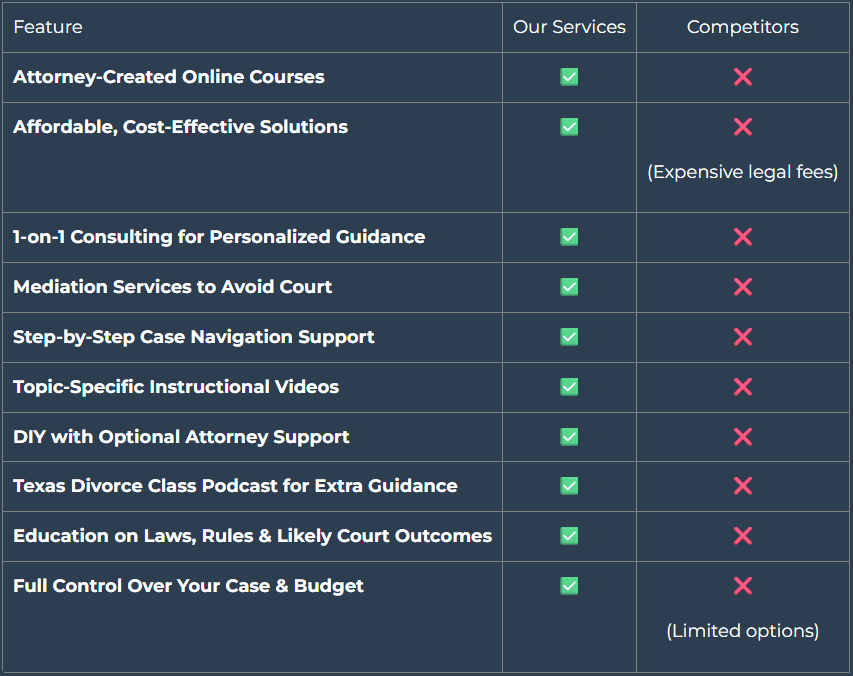 See how our services stack up against the competition. With us, you get everything you need to navigate your case effectively—while others leave critical gaps.